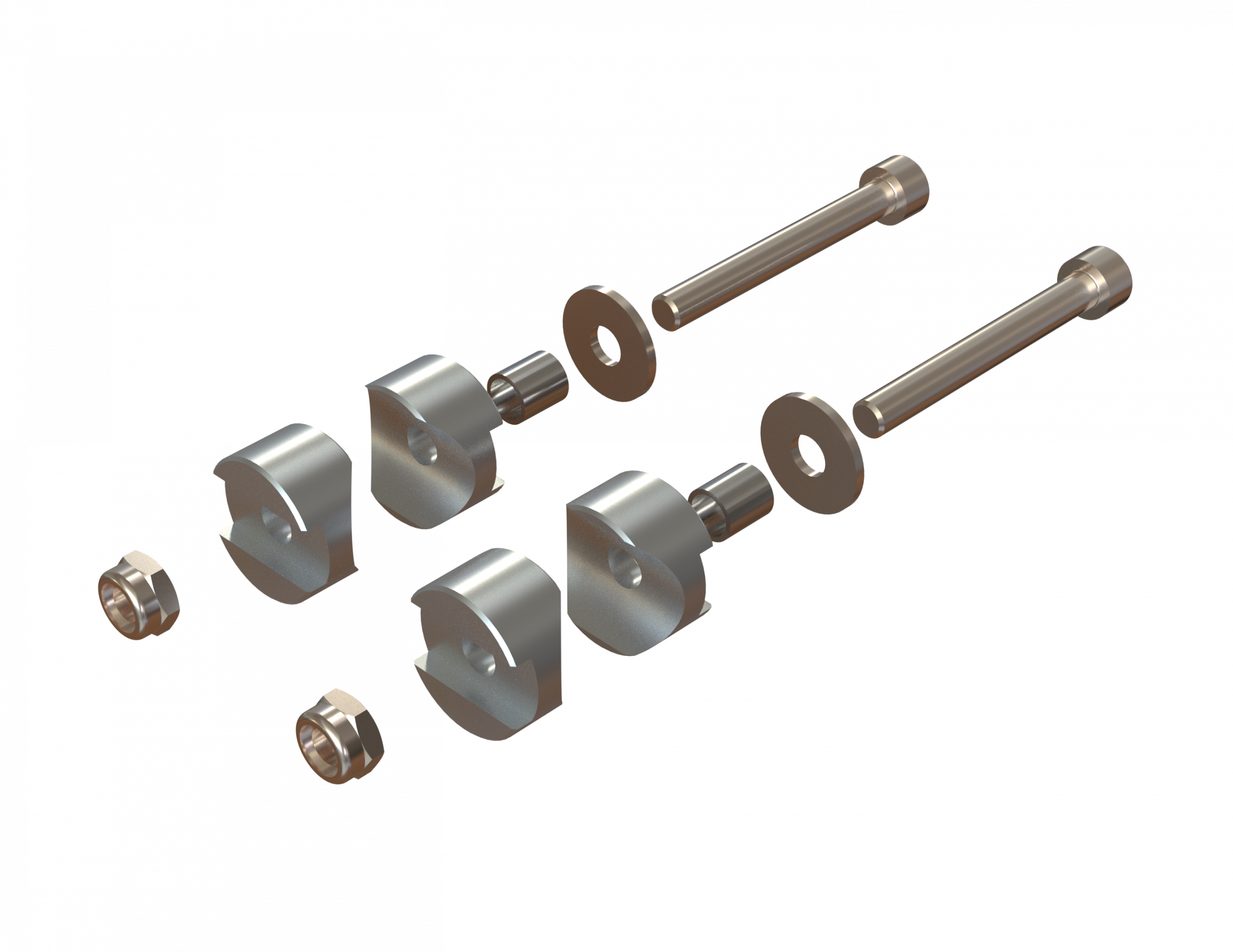 4 pieces of saddle washers to mount flat based frame clams on to 25mm tubes. 2x M6X50, 2x6,3 washers und 2 M6 nuts.