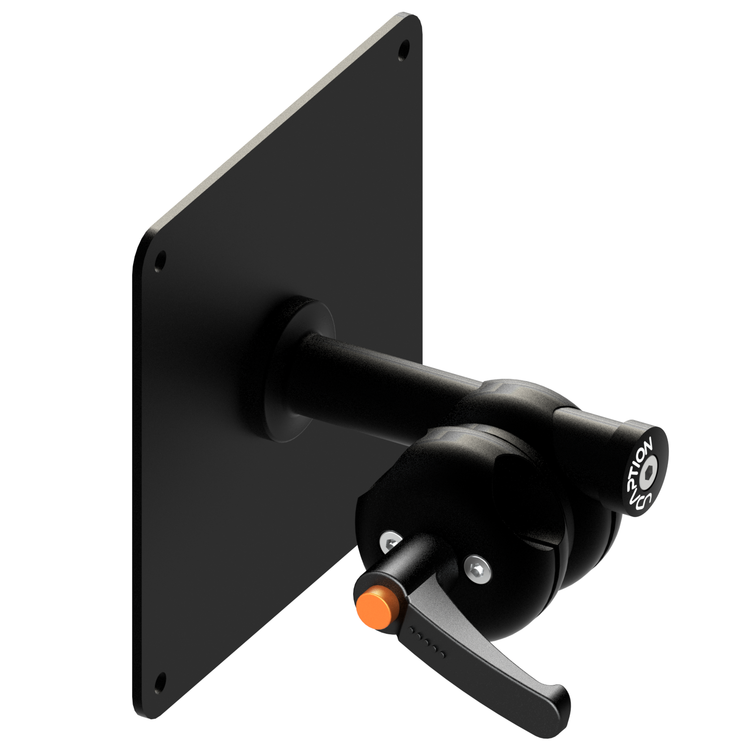 Wall mounting base with 22 mm tube including anti-slip protection. It supports 22 mm tube base, joints, frame clamps, frame qick couplers, etc. This means that existing wheelchair holders can be adapted to the base, to use them in another context.