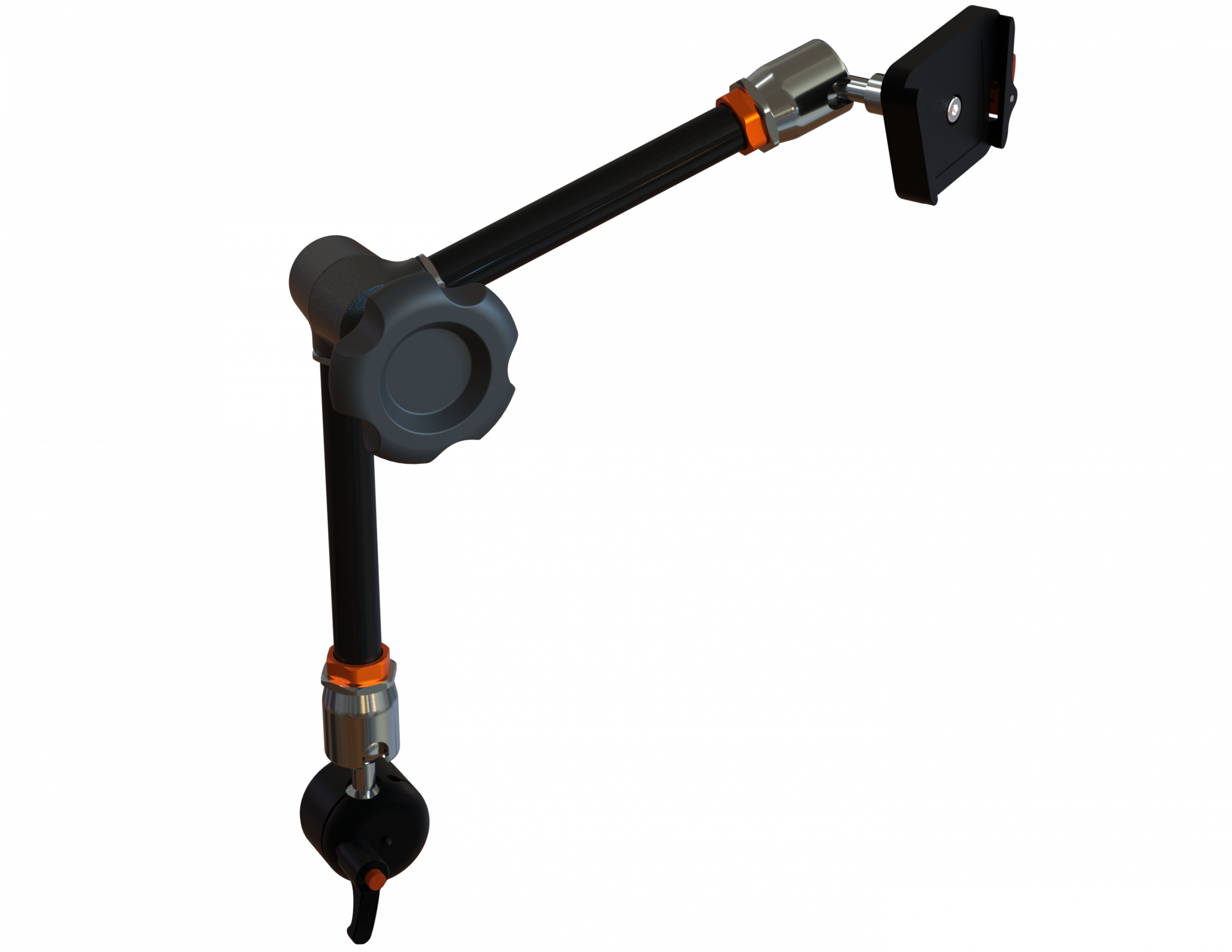 Rollstuhlhalterung mit mit 530mm maximaler Länge mit einem mittig liegendem Zahngelenk. UDA Geräteaufnahme. Max. Last = 3,0 Kg. Mit RKN 50 Aufnahme zur Montage an Udaption Rahmenklemmen, diese muss seperat bestellt werden.