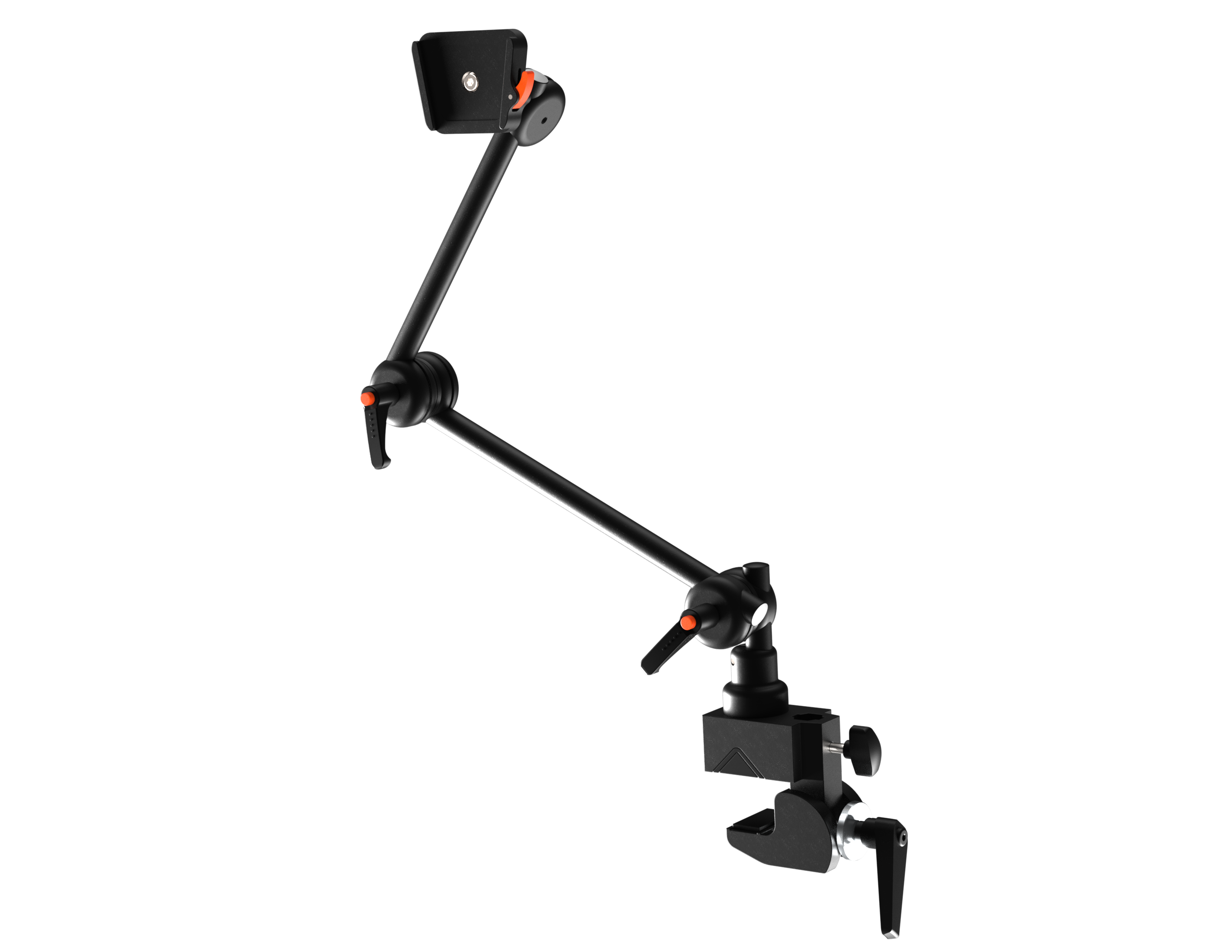 Tischklemme mit 300/250mm 16mm Ø Rohrkombination, welche mittels Rohrgelenk verstellbar mit der Klemme verbunden ist. Bestehend aus zwei x 16mm und einem 16/10mm Standardgelenk. -UDA Geräteaufnahme. Max. Last = 1,2 Kg.